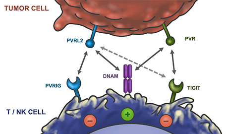 PVRIG is located on the surface of T and NK cells. Our research exploring the PVRIG pathway show that when bound to its ligand, PVRL2, PVRIG inhibits T and NK cell activity. Working in parallel and in complement with PVRIG in the DNAM axis is TIGIT, which was computationally discovered by the Compugen team in 2009. When TIGIT binds its ligand, PVR, it also leads to inhibition of T and NK cell activity.
